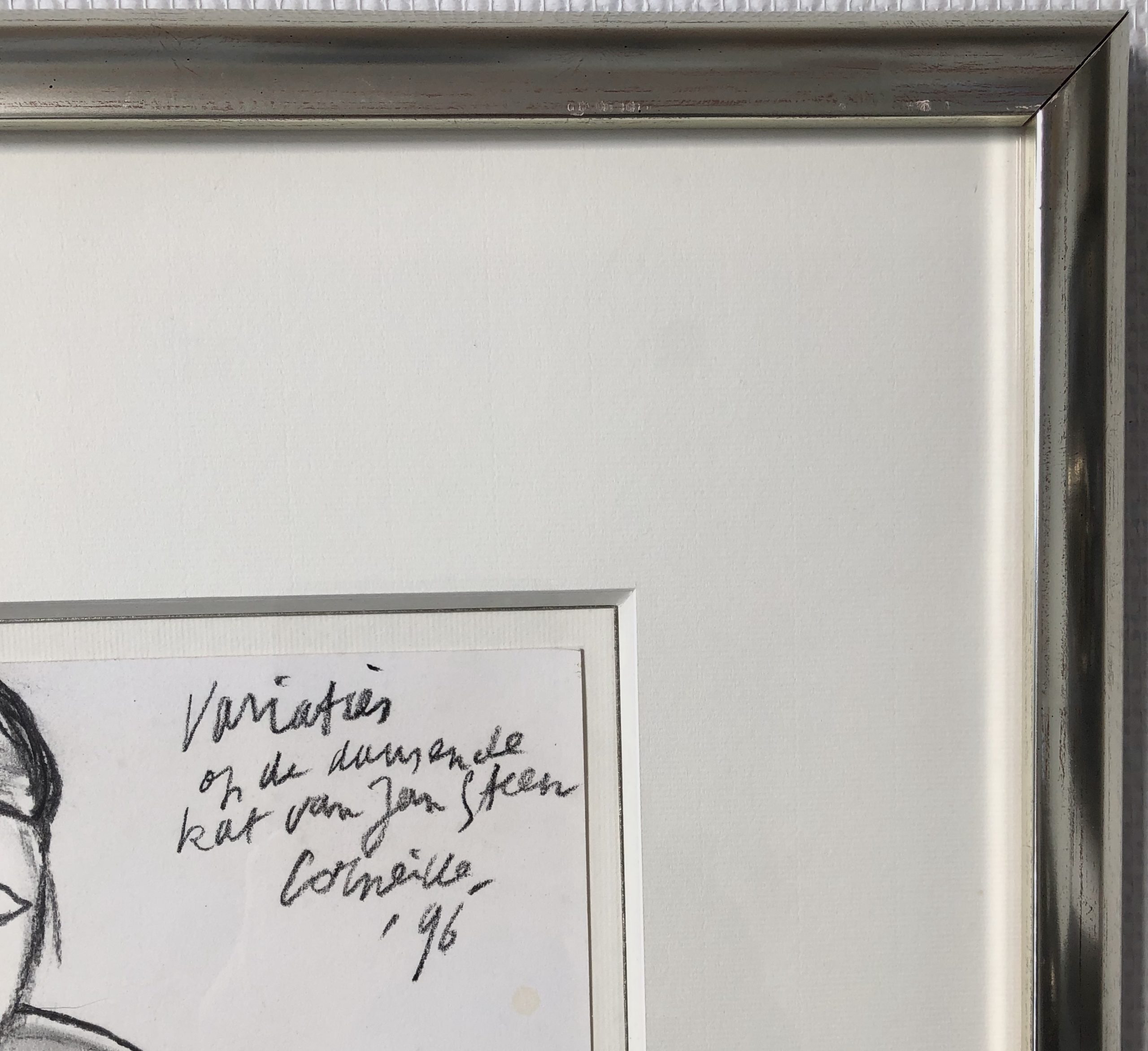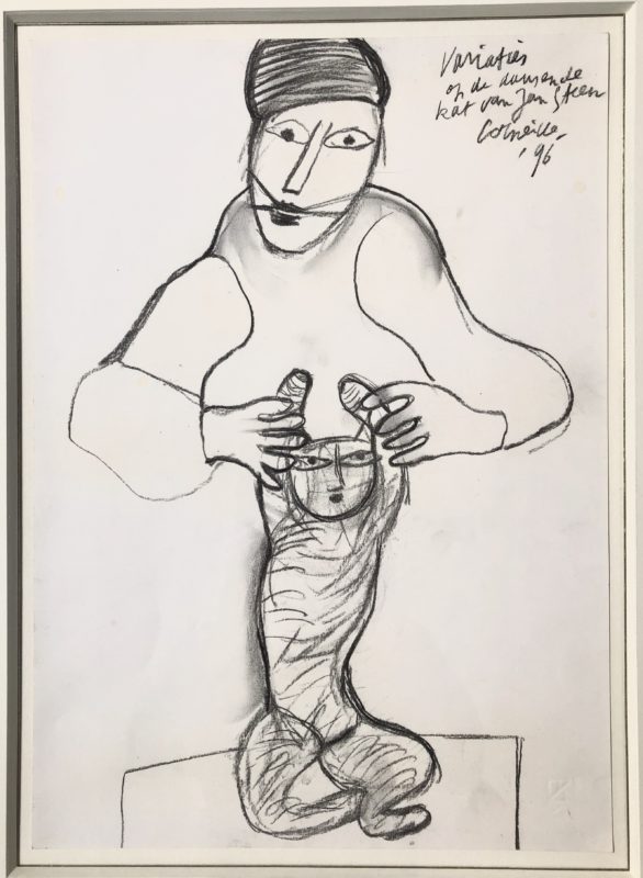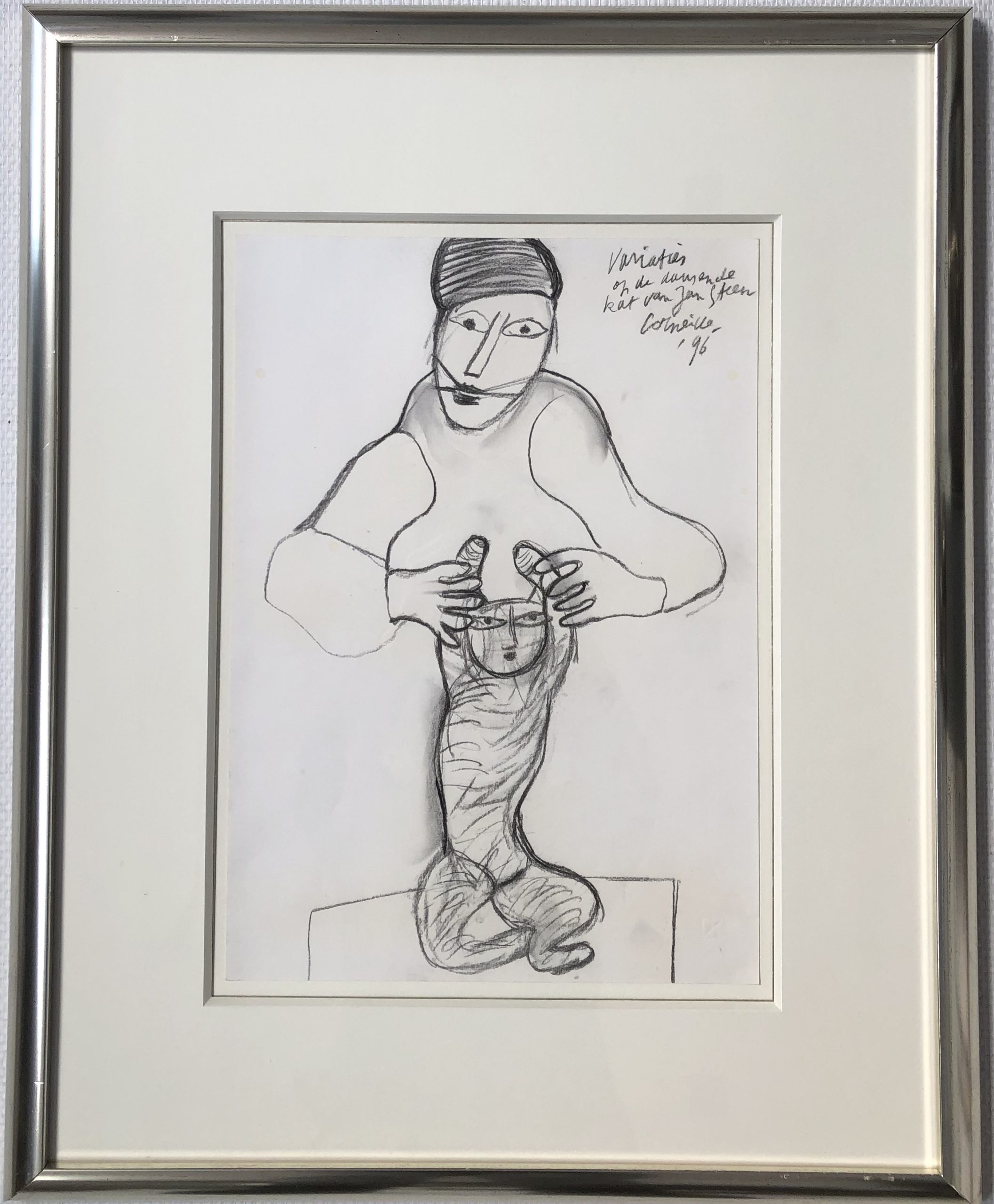 Corneille; Variaties op de dansende kat van Jan Steen Written by Houtskool tekening, gemaakt in 1996 Lijstafmetingen 77 x 63 cm Papierformaat 47 x 34 cm Handgesigneerd met toevoeging jaartal en titel rechts-boven Prijs 3.000,= Interesse? Uw naam Uw e-mailadres Uw telefoonnummer Uw vraag of bericht